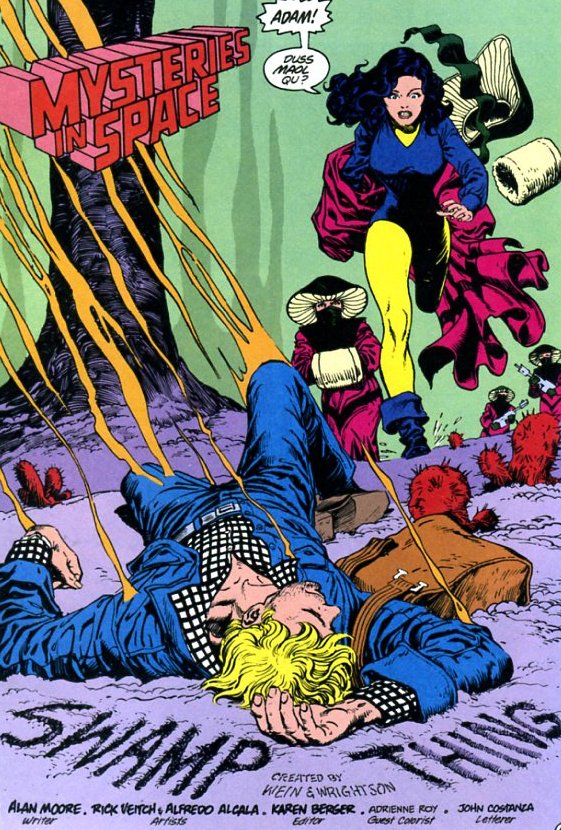 Moore intentionally deals-as all mindful comic creators do- in this recast that can all too easily cause common confusion from changed continuity, in that writer Len Wein and artist Berni Wrightson 'conceived' the Swamp Thing in House of Secrets, issue #92, June-July 1971, wherein the debut story the lead scientist prior to purportedly being transformed into the Swamp Thing was named Alex Olsen. After the success of the initial story, Wein and Wrightson were asked to present a feature monthly comic book of a combined decision to update the scientist renaming him as Alec Holland, working in the Louisiana swamps. These re-workings are not at all uncommon in ongoing comic book creation, even as much as some endeavor to adhere to a prior history, with resurrections or renames constantly popping up. Alan Moore, being in particular involved in playing upon these dubious reappearances takes a clever, and poignant insight round the myriad manifestations drawn upon, where John Constantine being noticeable alike in blonde features to Alex Olsen- later Alec Holland- as well as other fair look-alikes such as Dr. Dennis Barclay (a supporting companion featured by Wein and Wrightson) and Adam Strange (a revived otherworldly traveler that in future stories attempts to aid the Swamp Thing in returning to Earth).